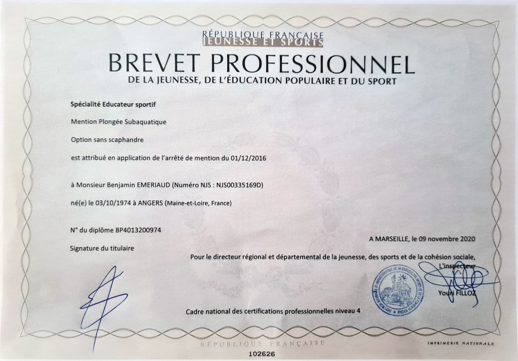 BPJEPS plongée sans scaphandre (Brevet Professionnel de la jeunesse, de l’éducation populaire et du sport) N° BP4013200974
