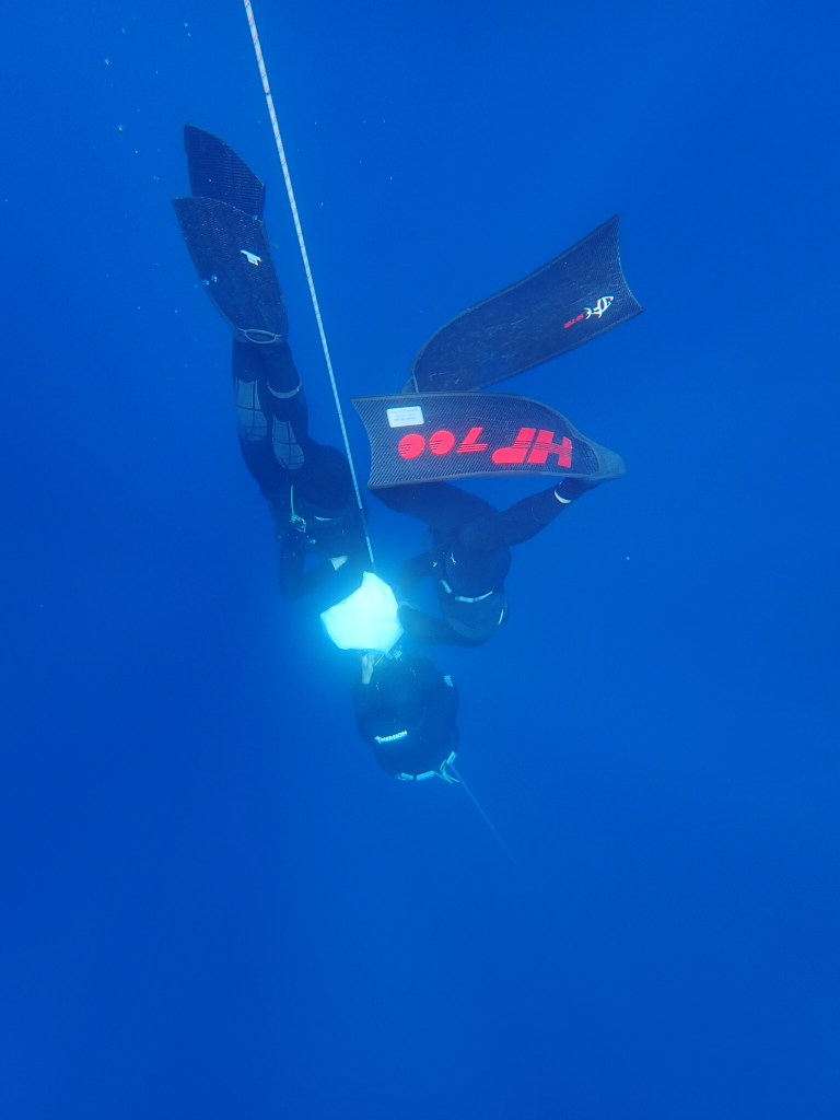 Le no limit c’est la discipline que l’on peut voir dans le film le grand bleu de Luc Besson. C’est une discipline assistée de l’apnée profonde, comme le poids variable classique, mais ici la remontée se fait aussi de manière assistée avec un ballon que l’on rempli d’air grâce à une bouteille de plongée. Cette discipline est ludique et permet de travailler le relâchement et la compensation sans réaliser aucun effort physique. La gueuse qui pèse entre 20 et 40Kg permet de s’immerger à plusieurs en même temps, ce qui peut être un avantage dans l’encadrement de l’apnée profonde.